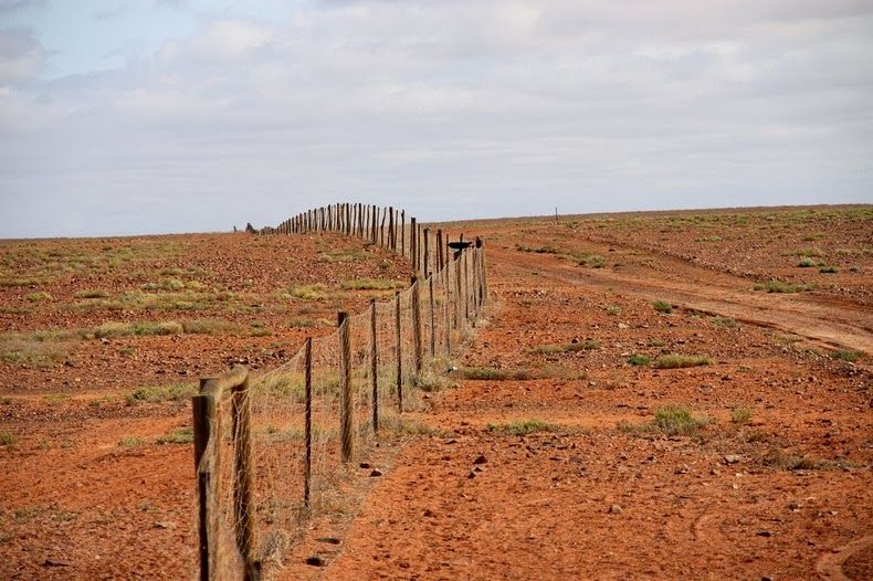 The fence is intended to keep the dingoes, i.e. Australian wild dogs, away from the sheep farms. The dingoes are a real plague for the sheep breeders: once the wild dog has found access to a herd, it kills several sheep at once.
